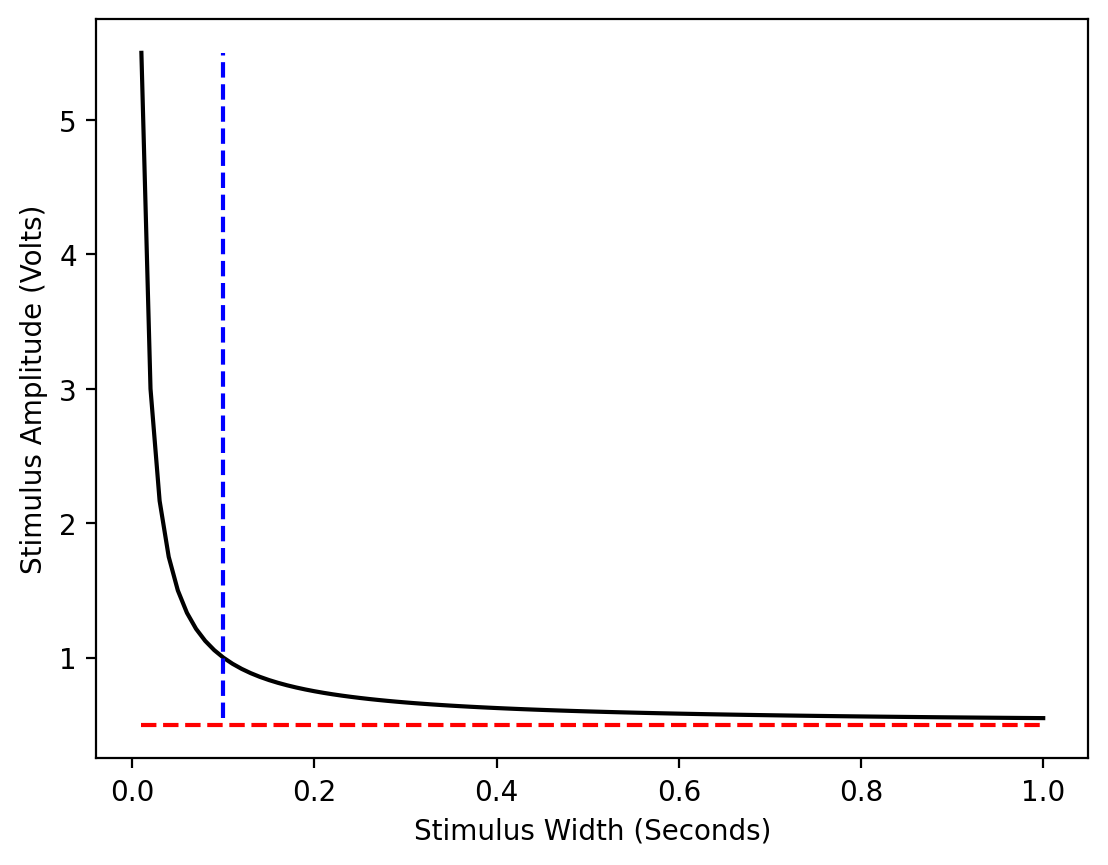 where a is the stimulus amplitude (in amps or volts), r is the rheobase, c is the chronaxie, and t is time (the width of the stimulus).